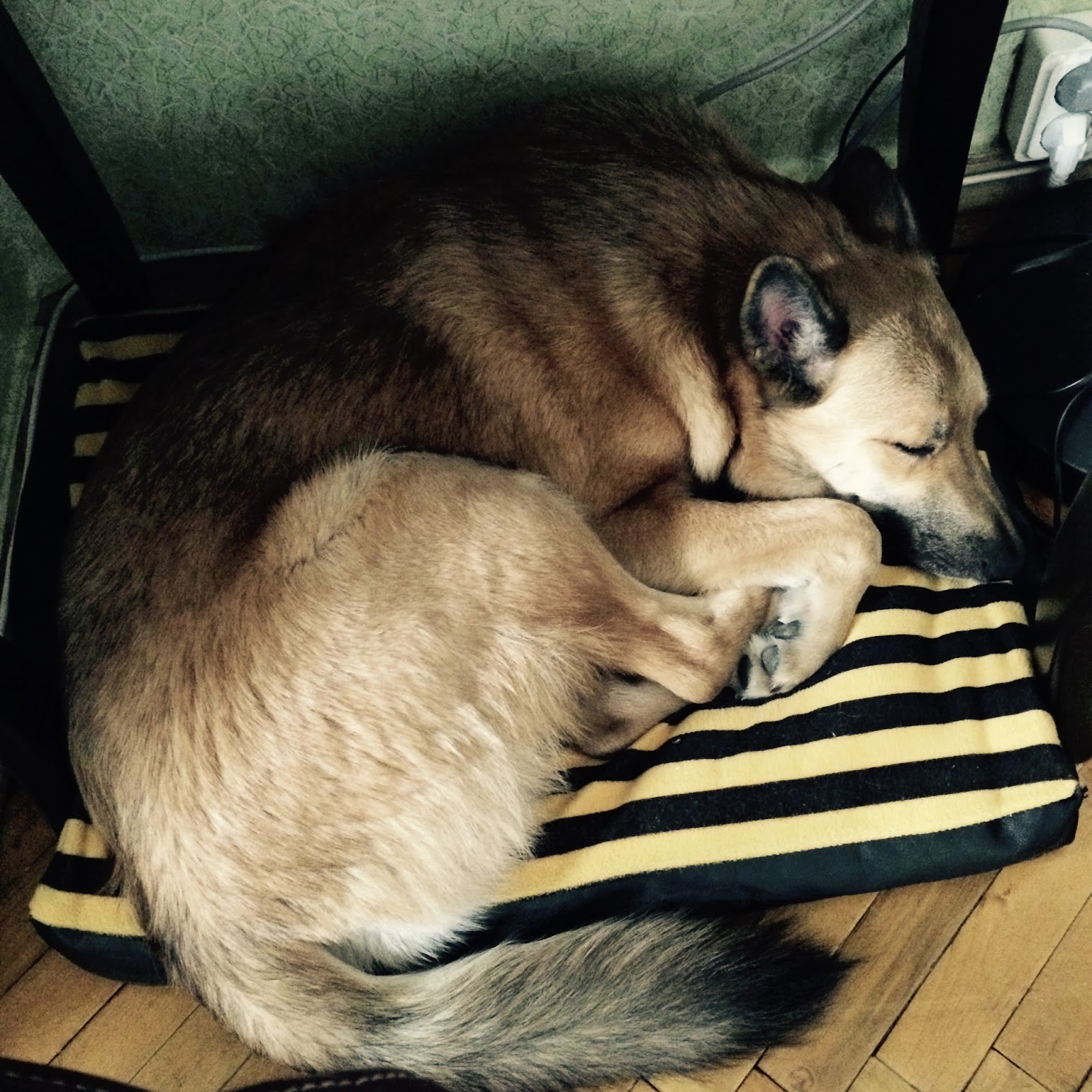 Сейчас вот такой лис, на любимой лежанке. Рядом с моим рабочим столом. Ютится, хотя у него есть лежанка и побольше в другом месте )))) Но видимо у него есть слабость к пчелам ))